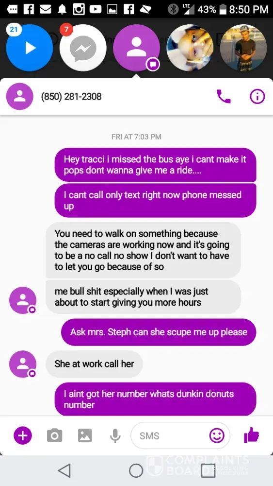 I've been working two month missed three days . late three times because of location . my boss has been treating me bad since day one i do my job good custumers love me . i even work extra hours. my boss told me she was takinh me off schedule a week because shr couldn't afford to pay everyone then ask me to work n i couldnt mske it. i called to ask for new schedule and she text she wasn't putting on schedule anymorr. now im jobless. she brings her 10 yr old daughter to work n she not an employee. all the staff complained about our boss because she dowsnt treat employees right . who do i talk to. im fired for no reason and she wasnt even going to call and tell me. thats so unprofessional.