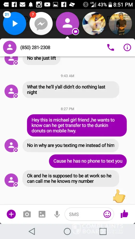 Hi my name is deangel montgomery i was emailing you guys because of a manager of dunkin donuts in gulf breeze 250 Gulf Breeze Pkwy, Gulf Breeze, FL 32561 by the name of Tracci ruff is threating her empolyees inside of the resturants she has black mailed several of her employee and i am a witness to this inccident my husband work there Night and day, she threat him and he has a stomach virus from the donuts that are eatin over there, she also harasses me in order to get him fired i want this to stop before it goes out of hand she does not want to transfer him because she is dating his brother and refuse to let my husband slip even on a stomach virus and its causing other costumers to have gotten sick she is causing people stomach viruses and still haing them work, the maddness have to stop shes causeing disgusting service and seem to sometimes never cleans her racks . the screen shots are how she treat her workers and he couldnt come in that day cause he has a stomach virus but she does not care the manager by the name of tracci ruff