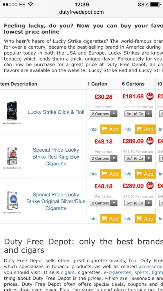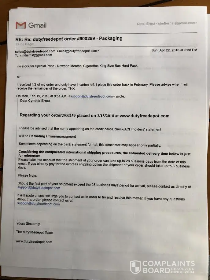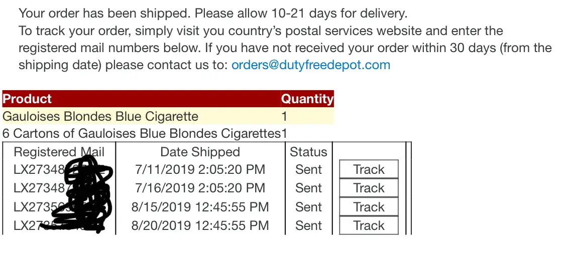 I placed an order with dutyfreedepot on 3/30/17.The order was 2-cartons of cigarettes.The order arrived within 3-weeks, and I was very satisfied.I placed another order on 3/30/17 and they have not shown up as of yet.I have e-mailed them twice and they do not reply back.I have called three different phone numbers that they supplied to me, and there is no answer at any of them.By them not replying back to me tells me that they are not on the up and up.Did I mention the order that is not showing up is only my second order that I have placed with them, and was larger than my first order.Hmmm seems fishy, does it not?I guess I am old enough to know better.My advice is to stay away from them.Hoping this review helps someone.