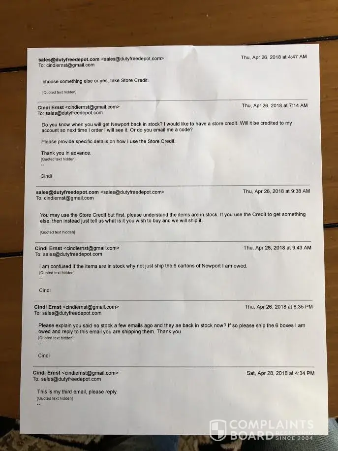 I wrote several letters mailto:[protected]@dutyfreedepot.com, none were answer.