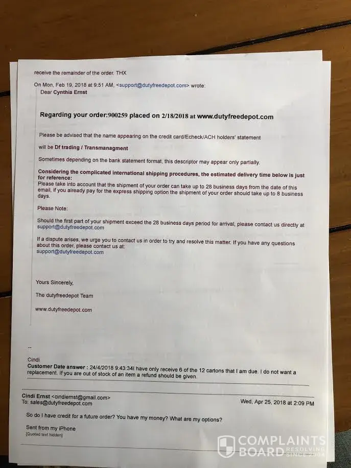 I order from DutyFreeDepot on July 2019. After several shippings I did only get my order partially on Dec 2019. And I decided to cancel my order and request a refund by Feb 2020 . I was shocked when I saw the refund was less than expected even when I proved with picture and evidence that I received less product than they thought. It's completely unbelievable lack of ethic what DutyFreeDepot is doing