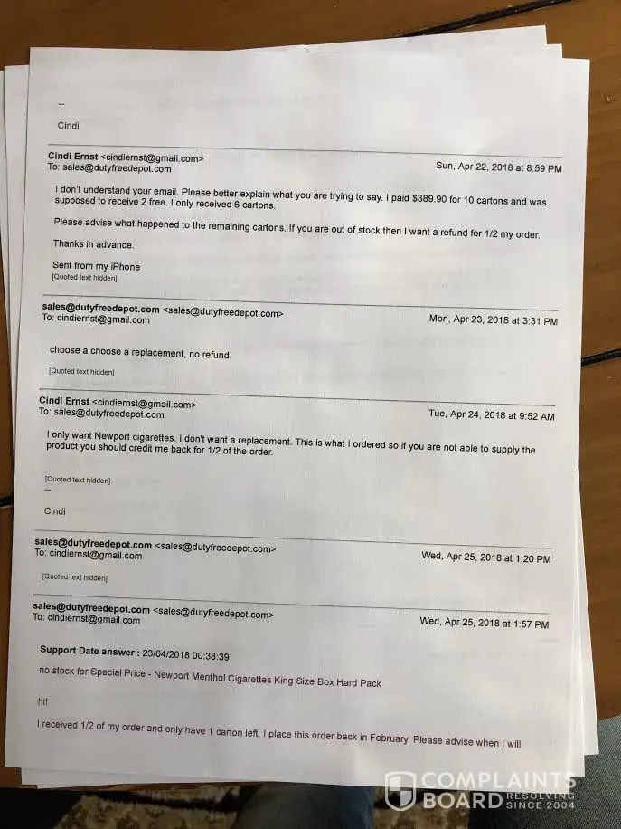 I placed an order on February 28 for 12 cartons of cigarettes. My order number is #900259. I received 6. I have been emailing them only to receive conflicting messages that there isn't any stock, pick a replacement, or I can have a store credit. No explanation on if it would go to my account for a new order or email coupon. Then they tell me it is in stock. So I ask them to reply and I say please ship the remaining 6 cartons I am owed and never received a reply. After several emails and no reply what can I do. I called their 800 number and it is a language I don't understand. UGH! ARGH! I called my bank and they can not help. I only want a refund for 1/2 of my money at this point.