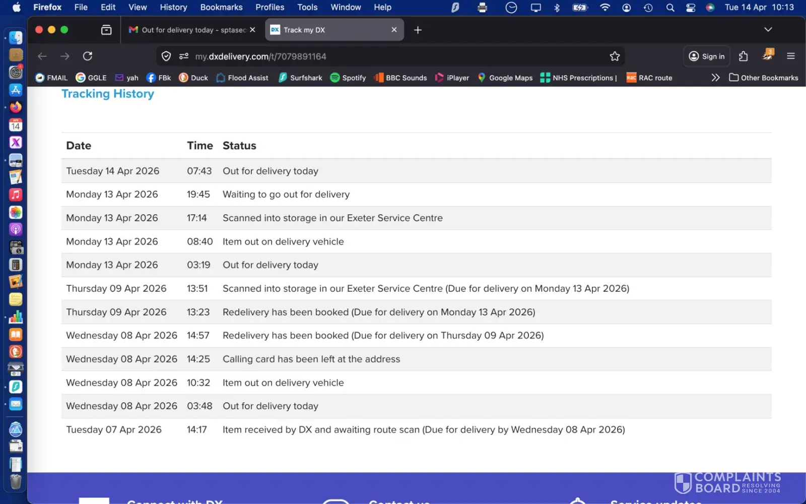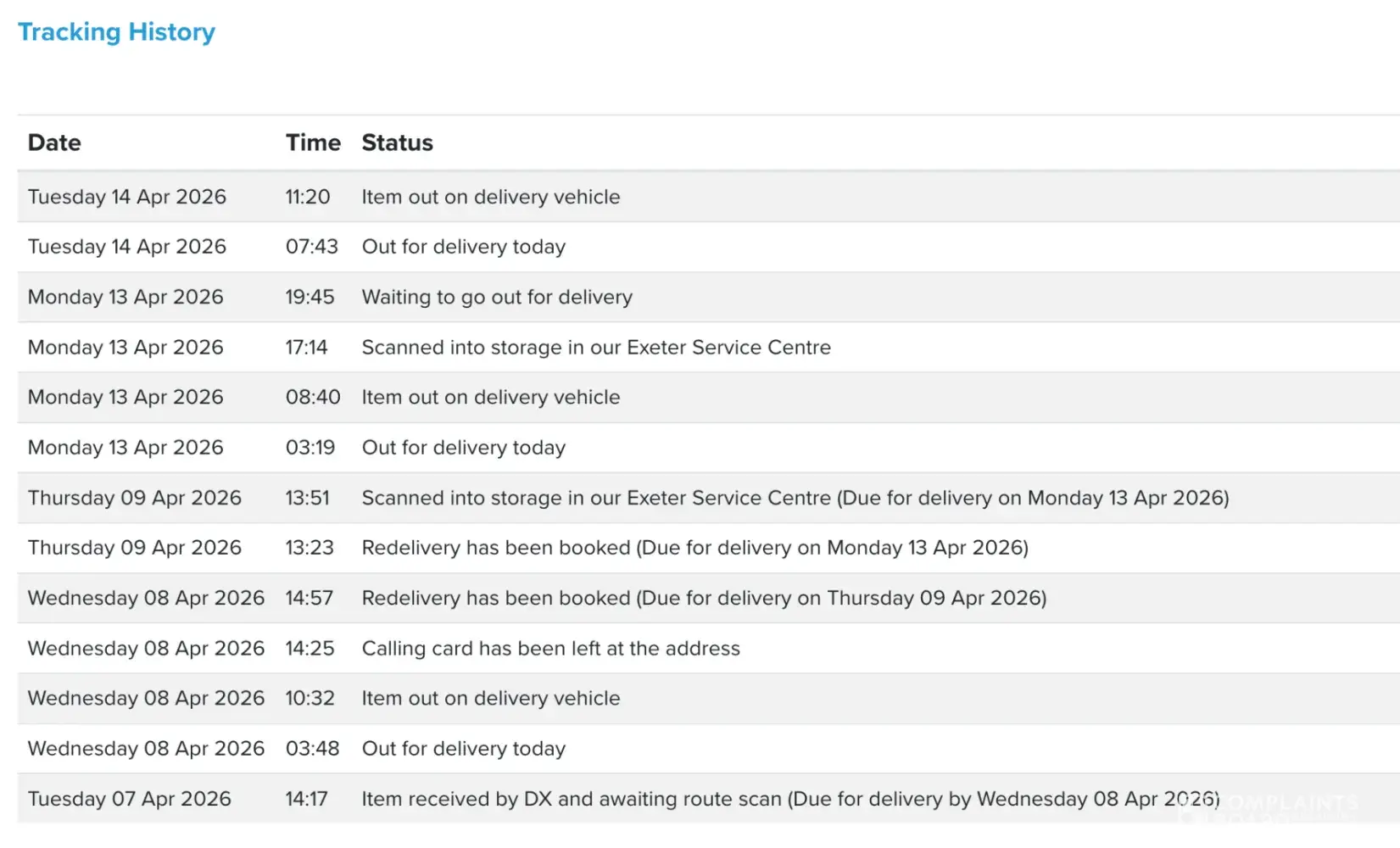 Refer attached tracking record screenshot (Parcel [protected] TA6 4TF) 1. 8th April: DX did not attempt to deliver, nor leave a card as stated on the tracking record (I was in-sitting within 3 metres of my door). Seller advised of failure) 2. 9th April: Rebooked by me- I waited in -DX messaged to say could not deliver and to rebook date. I advised the Seller...