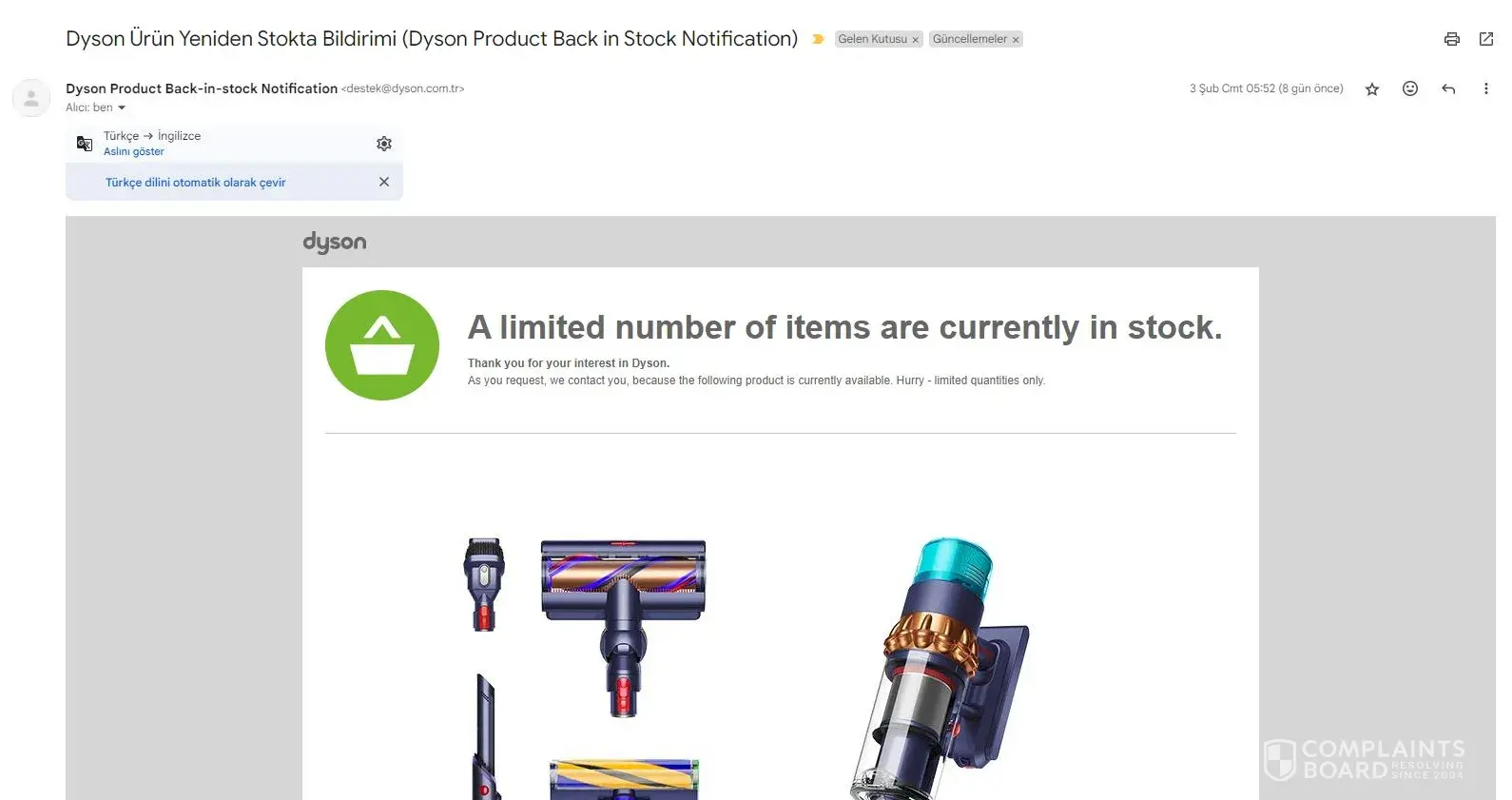 On Saturday, February 3, 2024, at 05:52, Dyson sent an e-mail, the screenshot of which I have attached below, informing you that the product has arrived in stock.. It was around 09:00 in the morning when I saw this message. I went to dyson website to buy it. I could not get.