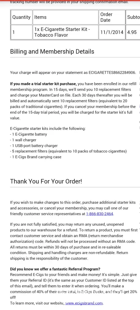 To anyone who is looking for E-Cigarettes, I strongly suggest staying away from this company! I will tell what happen to me but to give you a short summary, they offer a 15 day trial only charging $4.95 for shipping. What they don't tell you is that you are enrolled into a monthly charge program for refills, if you cancel your 15 day trial early, you are charged the full value of the starter kit (which is $125.00) and if you send back open products, you are charged the value of the open products. Finally, what they don't tell you is that they store your personal information (such as your name, address, phone number, email address and credit card information) and sell it to other company websites in the United Kingdom (since that's where their official company is based out of). I am also attaching the disclaimer from the email sent to me (with my information cropped out) so everyone can see how they charge you. I strongly suggest looking to another company for an e-cigarette than this company.