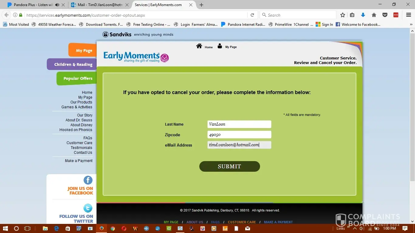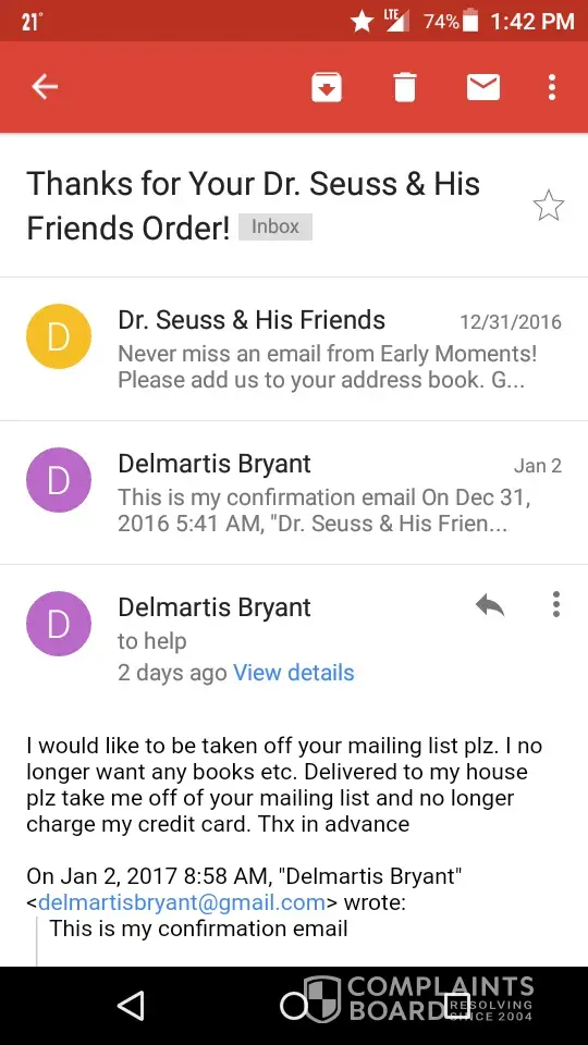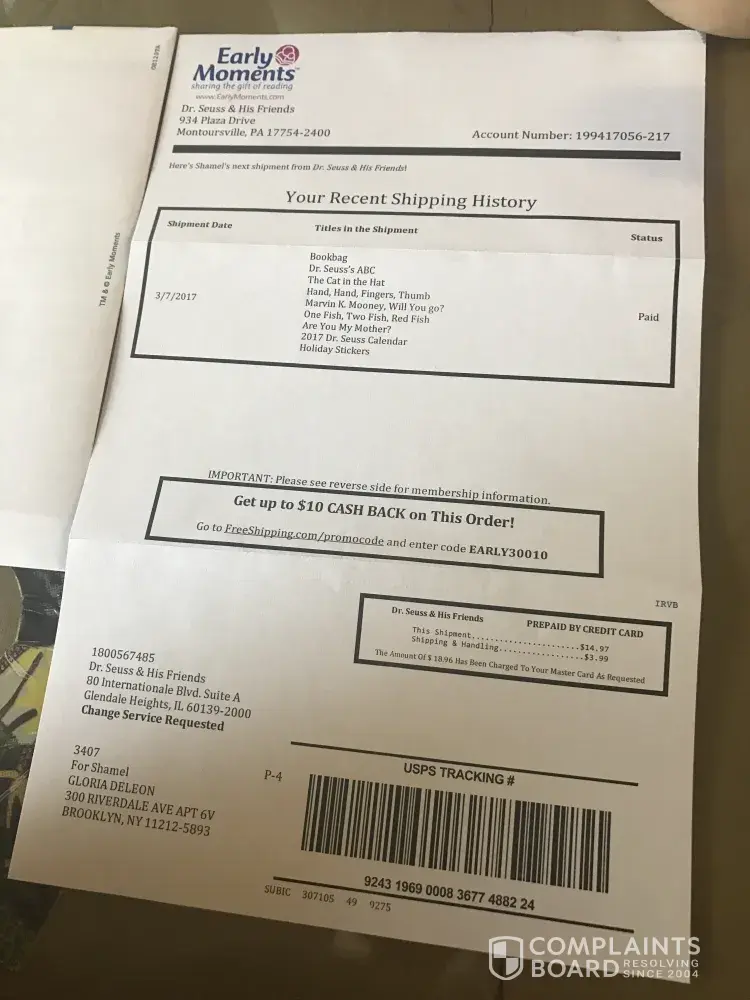 I'm writing on behalf of Early Moments, as we absolutely want you to have a positive experience with your book subscription. We're sorry we're just seeing this message now but you posted here on a third party site, not on our page, so we were not alerted to your post. Because you posted your account info publicly, I've gone ahead and cancelled your account for you, so you will not be charged again and will not receive any additional book shipments. If needed, please email me directly at jamie@earlymoments.com and I'd be happy to help with any additional questions or concerns. We are perplexed by why you had trouble cancelling, as our customer service team will always process a cancellation without protest when requested. Right after our Dr. Seuss's birthday promotion we did experience extremely high call volumes, so perhaps you had trouble getting through and that was the problem. We hope you can now consider this resolved. We recommend you remove your personal account info from your post above, to protect your own information.