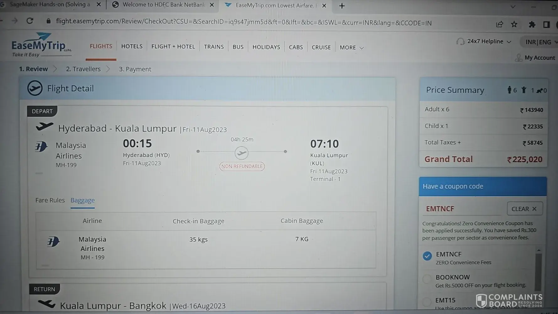 As per the attached screen shots from the Airlines, it's clear that I suppose to get a free baggage allowance of 35 kg for each person. After paying the full amount it is showing zero baggage. In between airlines never shown that my baggage reduced to zero or price has dropped or increased w.r.t first page.