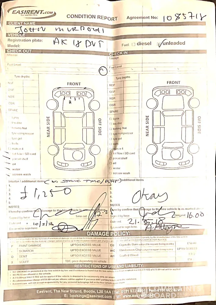 When I went to first rent the car I got the first whiff that something was not right. They forced me to leave a GBP 1250 deposit on my card. The guy behind the counter told me that I could reduce the deposit only by buying insurance at GBP 150. The car was quite dirty on the outside and the front left side was completely scratched and dented. This was circled in my sheet (have a photograph).