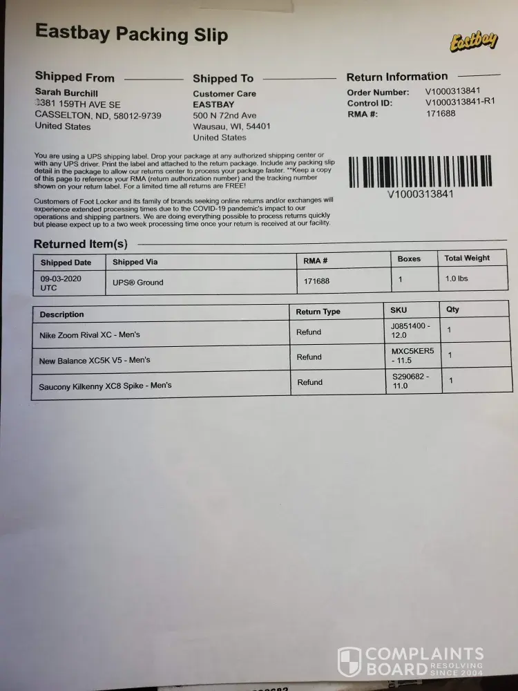 eastbay sucks: return not received and no exchange