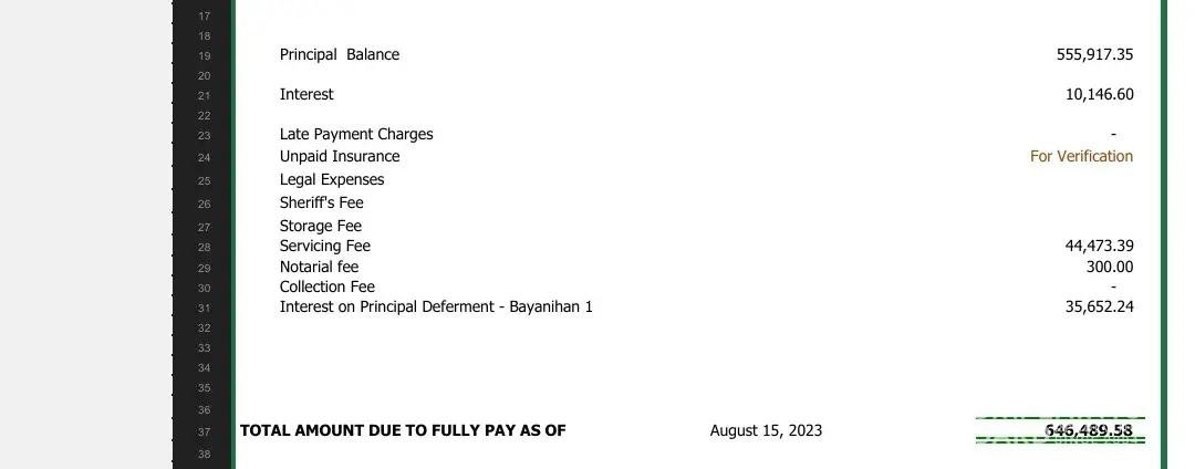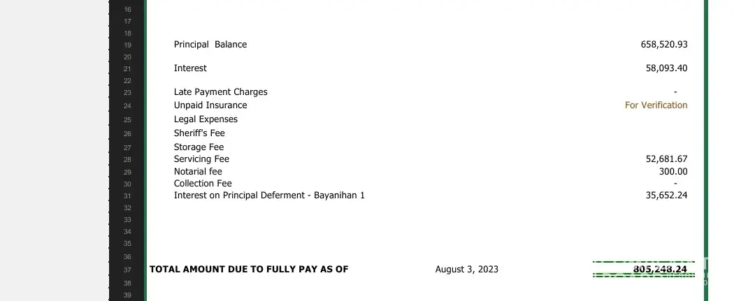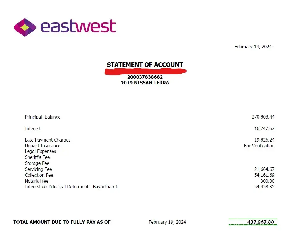 Next complaint is when I decided to pay everything on my auto loan. I requested for a SOA payoff and it indicated that I would pay PhP 805k just to settle everything including Principal Balance, interest, servicing fee, accrued interest from bayanihan 1 after paying at least 3yrs.