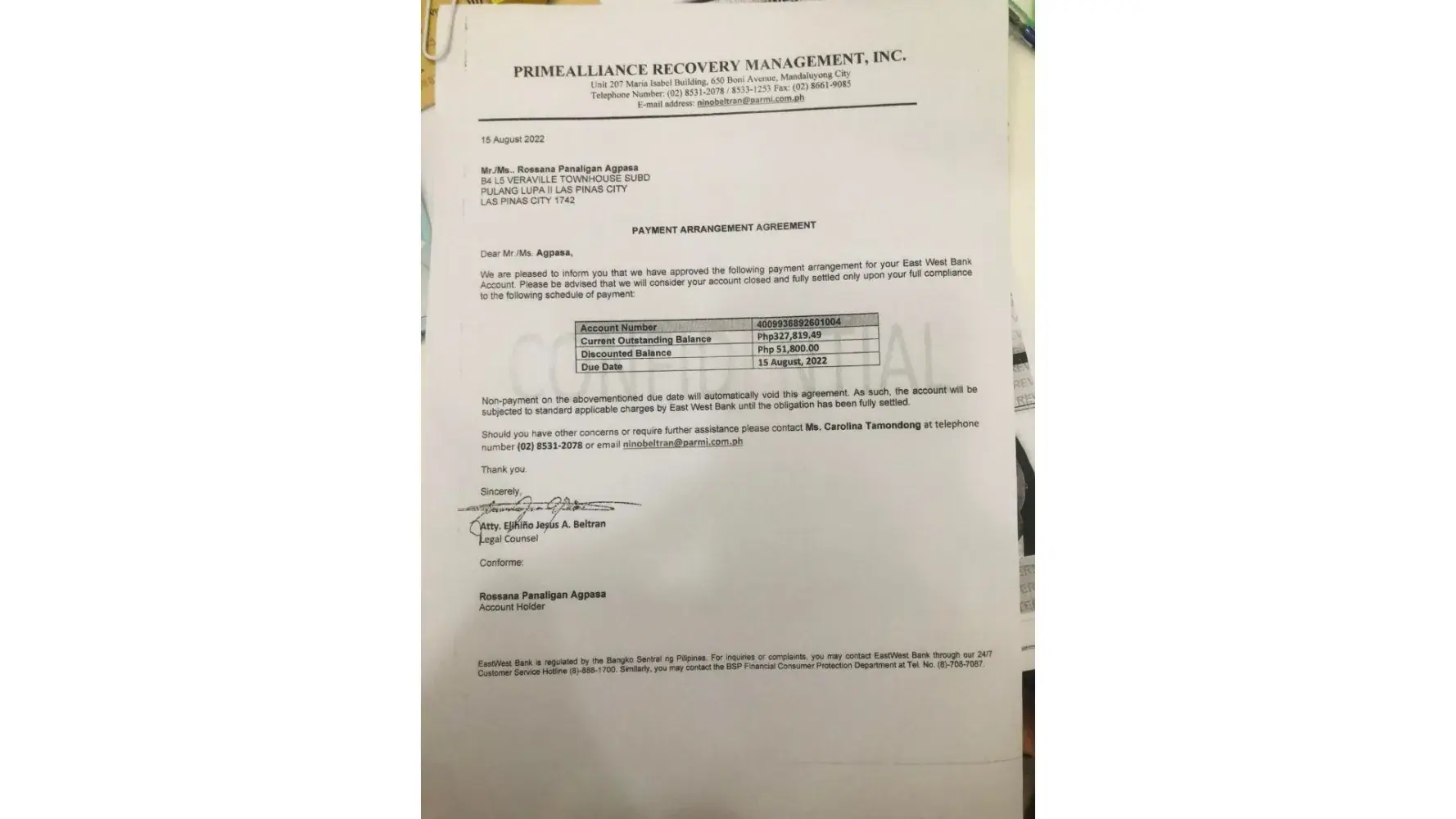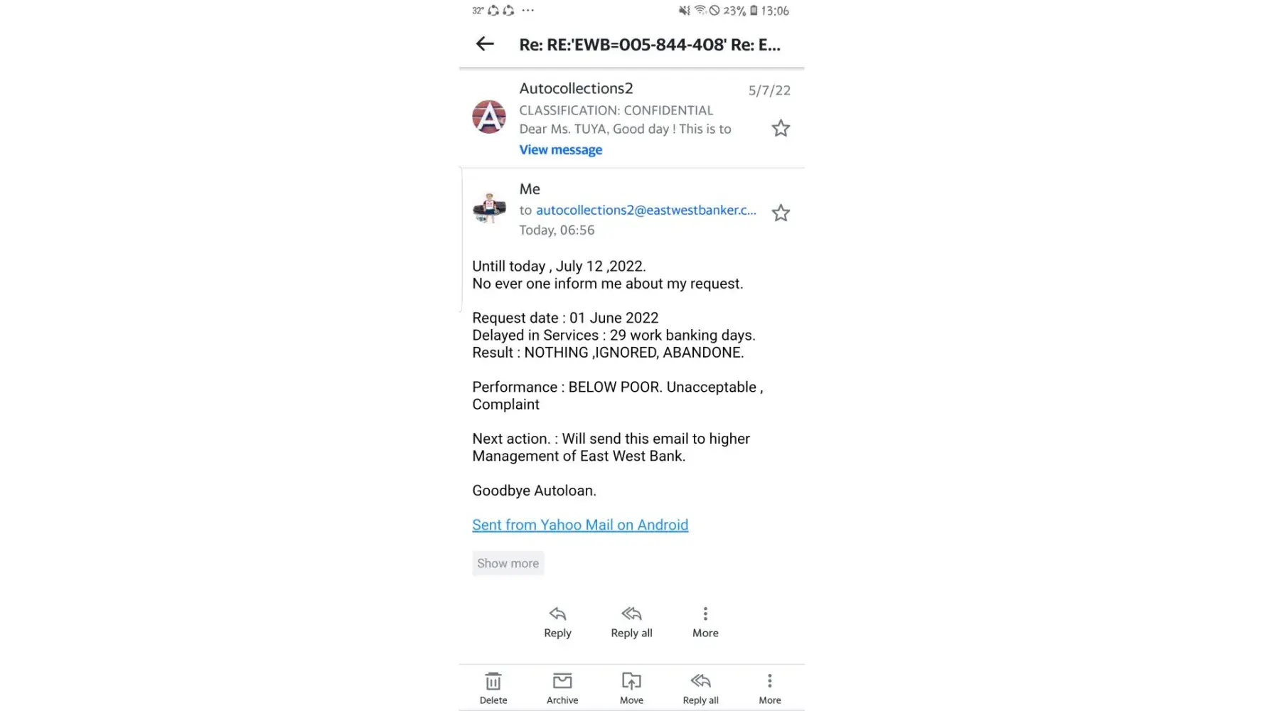 January 2022 we received an email from Convergent Recovery Management Services Inc. saying that our Eastwest Bank auto loan is due & demandable and failure to coordinate is Subject for Legal Action and Unit Pull Out. We immediately talk to this collecting agent explaining that this could not happen because we have 12 PDC's in their possession. So she (representative from Convergent Recovery Management Services Inc) reverted the account to Eastwest Bank. We tried calling the customer service and always been disappointed for the long queues and ended hanging up. At last one of the representative called and ask me for payment for the overdue accounts. I explained that they have our post dated checks how can we have arrears? She explained to me of the automatic enrollment to the Bayanihan Law in which we did not opted because all that checks are funded. As we traced to our bank, there are 9 checks that are not presented and are now stale. EB recognize that indeed there are stale checks in their possession and instructed us to send email requesting to recover that checks for replacement. And that is the start of waiting in vain. Replies are all automatically generated and no signs of good results. Every month a customer service representative would now call me and remind me of the past due account and how much we need to settle in full.