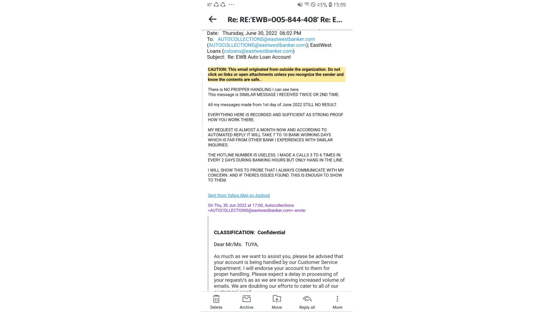 Despite the fact that the car monthly amortization were paid on time. Still East West bank charges are account with bayanihan act which we did not authorized. We've been communicating to the autocollection department and emailed the deposit slips they needed and said that they have not received our email. And yet they other emails that we have sent. It seems that they want us to pay them more before they will process the closure of the loan. Very poor service as this has been going on "doing the followup" for about a year already. Very disappointing. I hope people will not transact with East West bank in the future. Very poor service.
