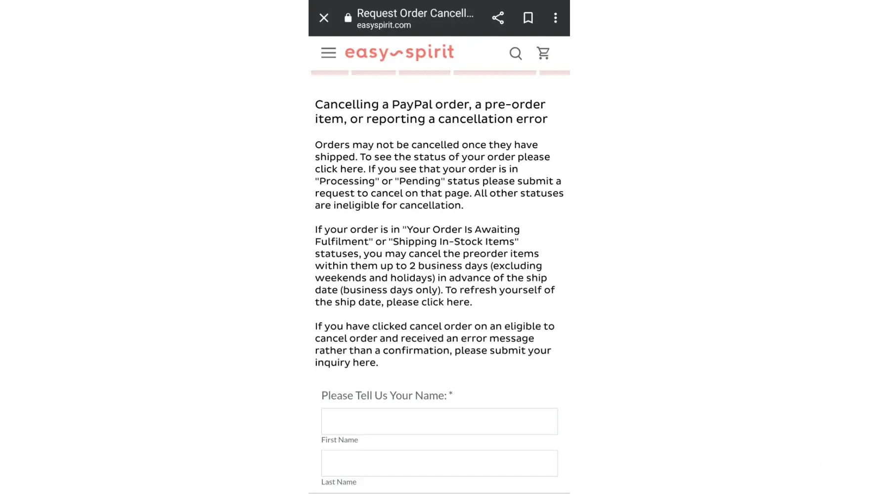 I went onto the website to cancel part of my order which I was directed to do on the form because it was a PayPal order, now my item is being shipped even though it's the wrong size of shoe and I wanted to cancel it. Since it was on sale I'm not even sure I can get a refund but because of this company's incompetence now I'm getting shoes I didn't want to pay for since I already cancelled them through the form.