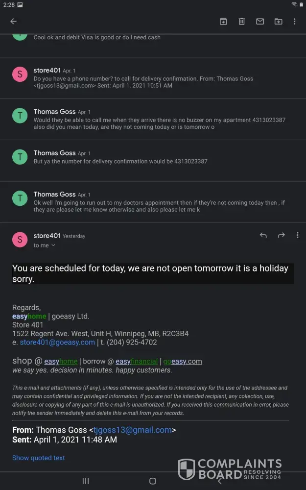 Hi im filing a complaint on go easy in red deer. I will be going to BBB as well. Mihajlo had gotten 1 day off from work on sunday. He had gotten kids some school supplies on SUNDAY WHICH GO EASY IS CLOSED. Yes we are behind and we are very sorry. But to have the red deer staff start messaging saying they seen him on sunday at dollarama, i feel like there stalking us and what happens on there time off and Mihajlos is privacy which should be respected by both parties... Someone needs to explain to these ppl that oilfield is nothing like there mon-fri jobs. They are on call 24/7 and work all hours of the night and another crew days. The company is cheap and makes them get a hotel because paying a supervisor to travel back and fourth to home and work cost them lots of money and time, and kilometers. WE DO NOT APPRECIATE THE TEXTS SAYING THEY SEEN HIM ON A DAY GO EASY WERE CLOSED THE FOLLOWING DAY THEY OPEN. AGAIN THREATENED LOCKSMITH AS WELL TO ENTER MY HOUSE. BBB WILL BE CONTACTED if nothing is done this time.