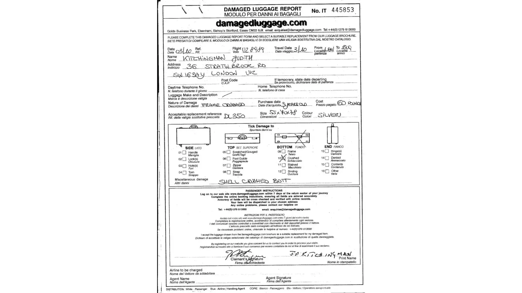 Damaged baggage complaint