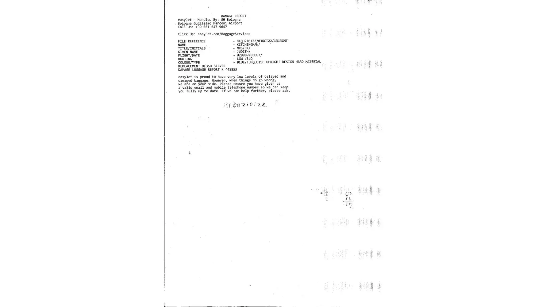 BLQU210122 is the claim made at Bologna airport on October 3.