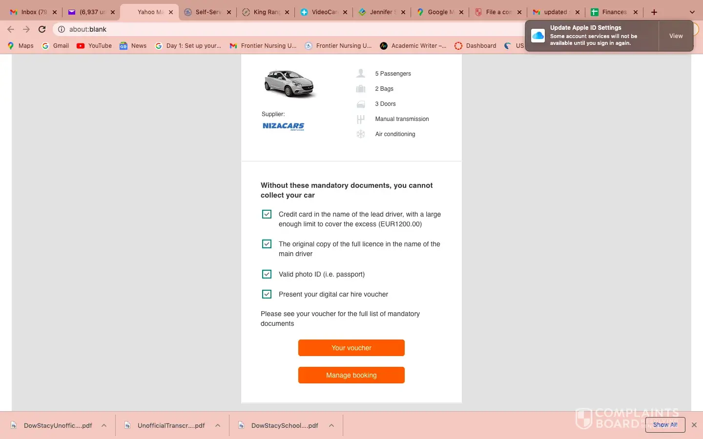 The same booking also included an 'EasyJet car rental booking' 26 April GB607513480 with EuropCar 26 April 2.05 pm and Damage Refund Insurance G001GBRGB607513480 26 April 2.13 pm, all paid for at the same time. I subsequently received 'Confirmation of your Damage Refund Insurance for your car hire - G001GBRGB607513480' with 4 pdf documents to my iPhone 26 April 2.26 pm.