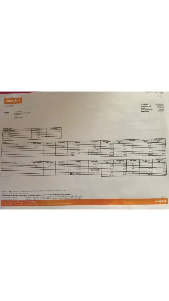 02 APRIL 04 APRIL EASYJET000K2V22H9 LUTON, BEDS GBR 58.48 CR- 02 APRIL 04 APRIL EASYJET000K2V22H9 LUTON, BEDS GBR 123.46 CR- 02 APRIL 04 APRIL EASYJET000K2V22H9 LUTON, BEDS GBR 125.90 CR- 02 APRIL 04 APRIL EASYJET000K2V22H9 LUTON, BEDS GBR 60.92 CR- 02 APRIL 04 APRIL EASYJET000K2V23V4 LUTON, BEDS GBR 62.88 CR- 74.48 EUR @ 1.1845 02 APRIL 04 APRIL NON-STERLING TRANSACTION FEE REFUND 1.85- CR 02 APRIL 04 APRIL EASYJET000K2V23V4 LUTON, BEDS GBR 146.44 CR- 173.46 EUR @ 1.1845 02 APRIL 04 APRIL NON-STERLING TRANSACTION FEE REFUND 4.31 CR total £584.24.