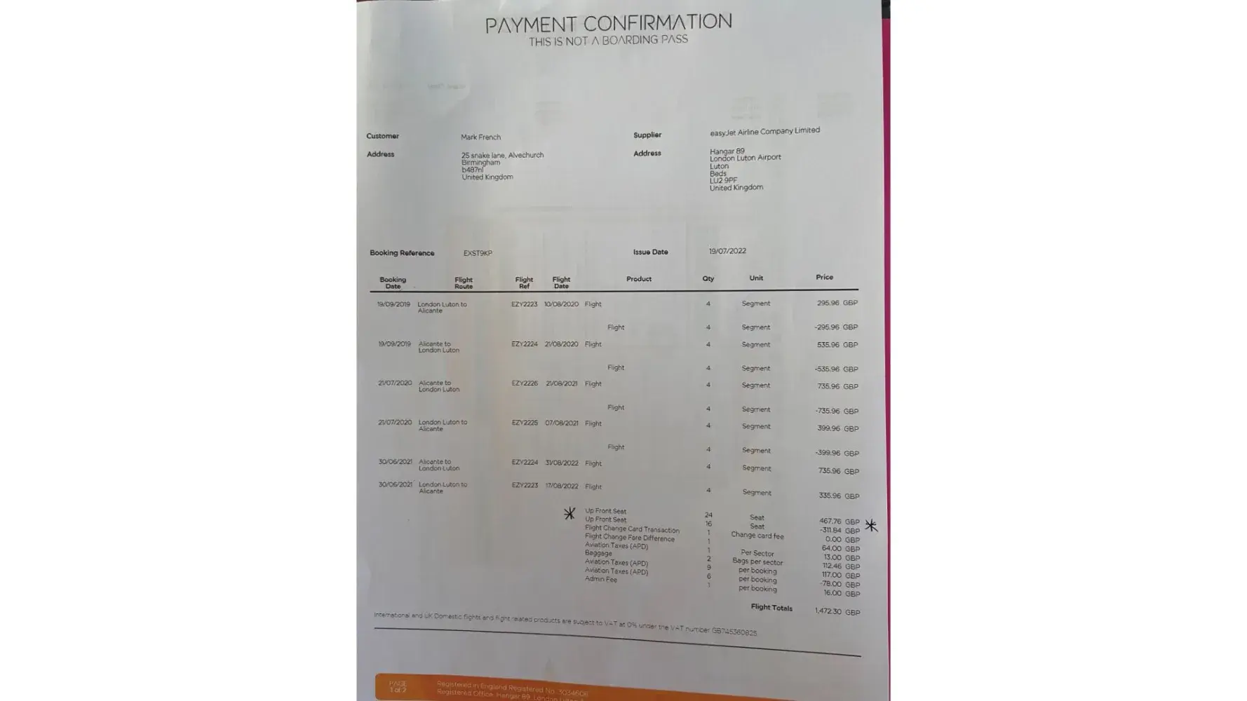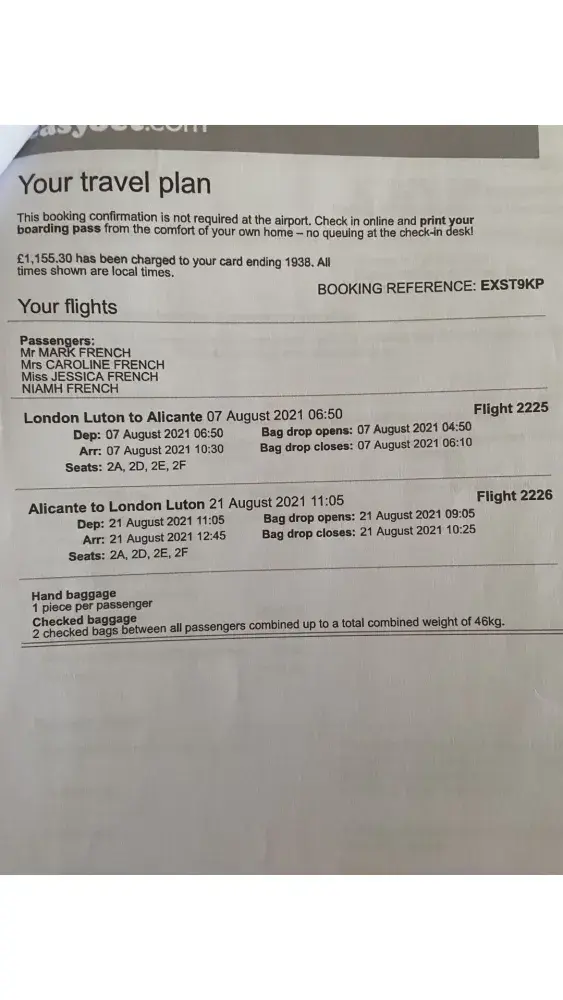 We originally booked flights from Luton to Alicanted on 19th September 2019 to fly in the following year in August 2020, we also paid and we wanted to pre-book our seats as Mrs French is disabled and needs extra leg room and an aisle seat. We therefore booked 2a, 2d, 2e and 2f and we also wanted x2 window seats.