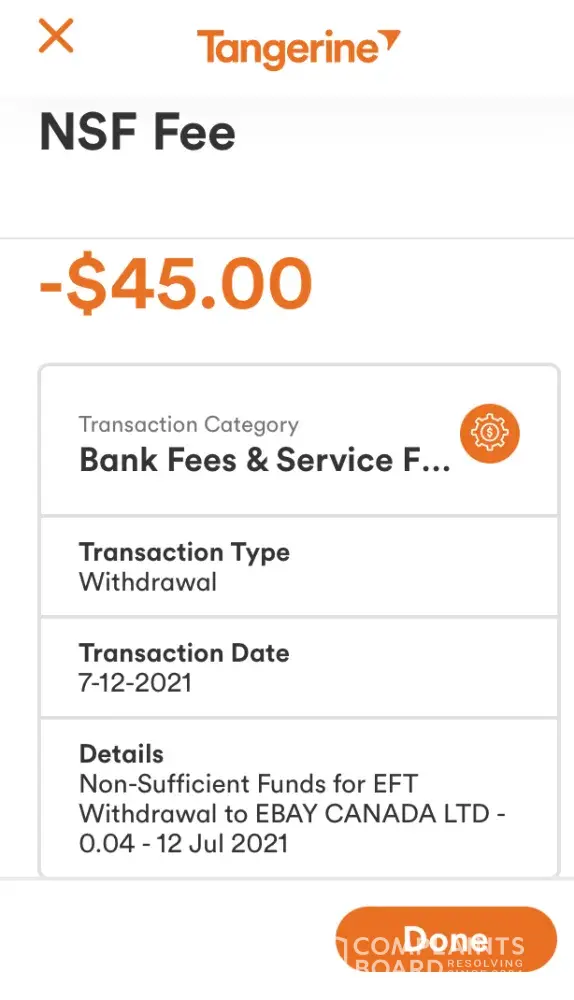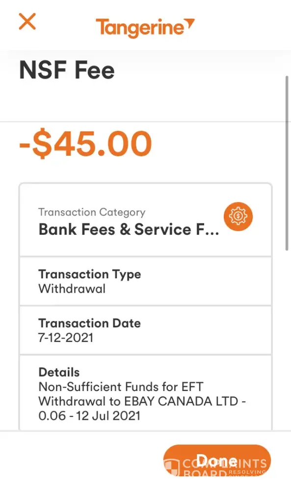 On June 30, 2021, Ebay withdrew $0.38 from this account for a seller refund, without my knowledge or consent for which I incurred a $45 NSF fee from my bank.