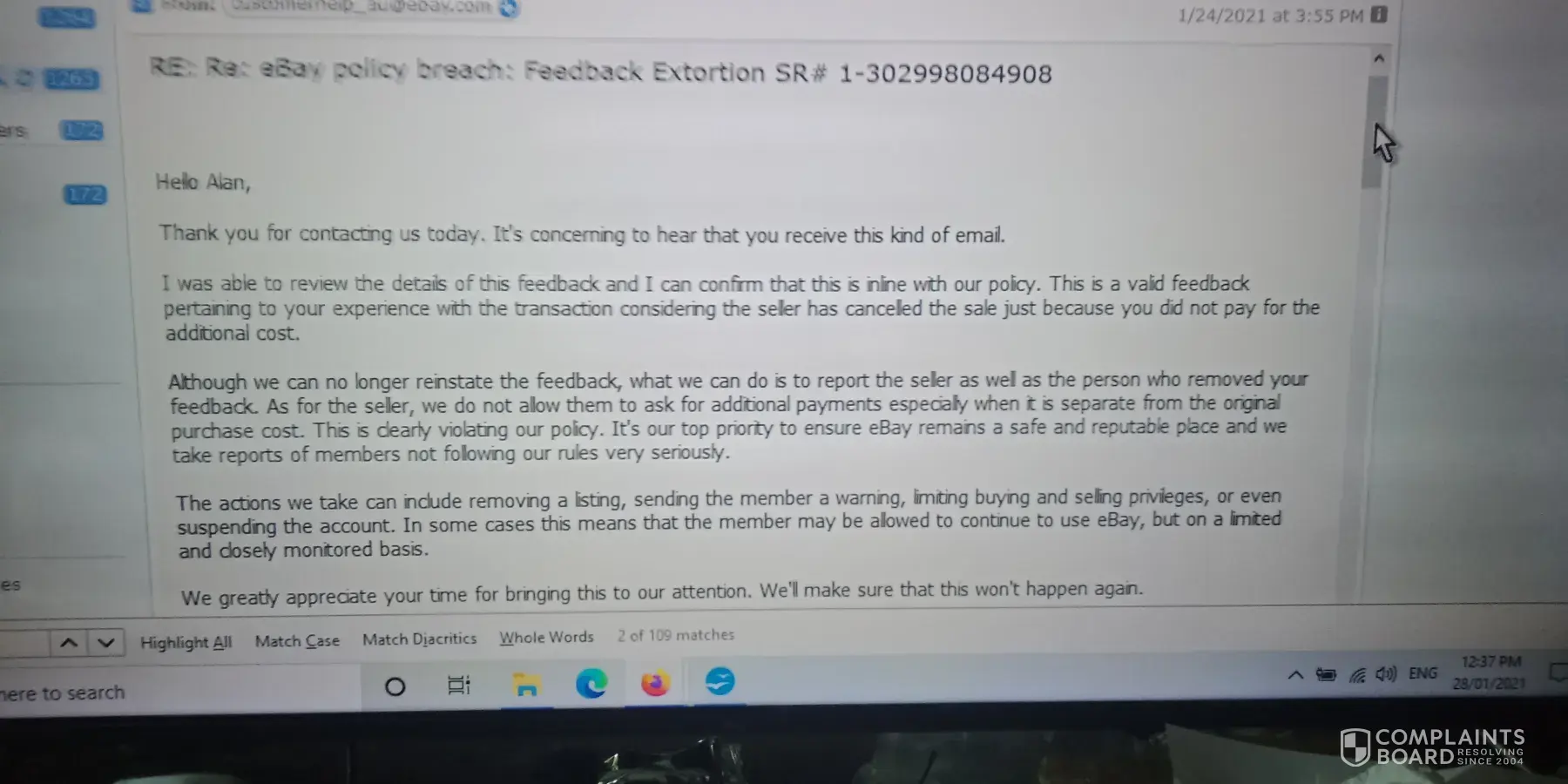 I purchased and paid for an item. I later received an email from the seller (not threw ebay) requesting more money on top of the original postage cost, clearly a breach of ebay's police. The seller cancelled the sale. I left legitimate feed back simply stating (this seller can not be trusted) to which ebay removed the feed back and accused me of extortion.