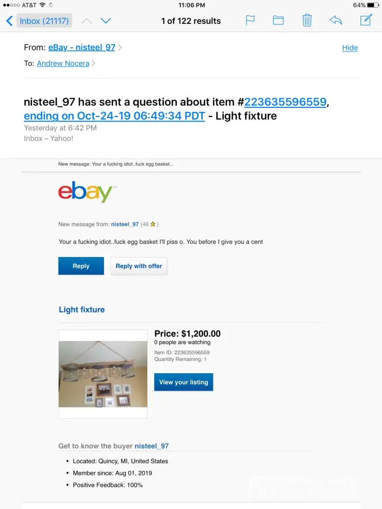 Please review the email sent to me from "Re: nisteel_97 has sent a question about item #[protected], ending on Oct-24-19 06:49:34 PDT - Light fixture".