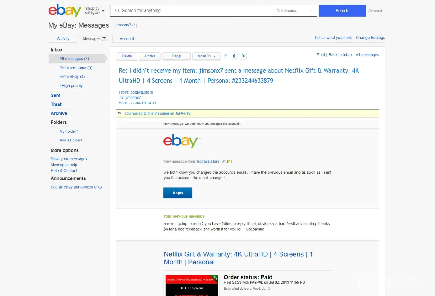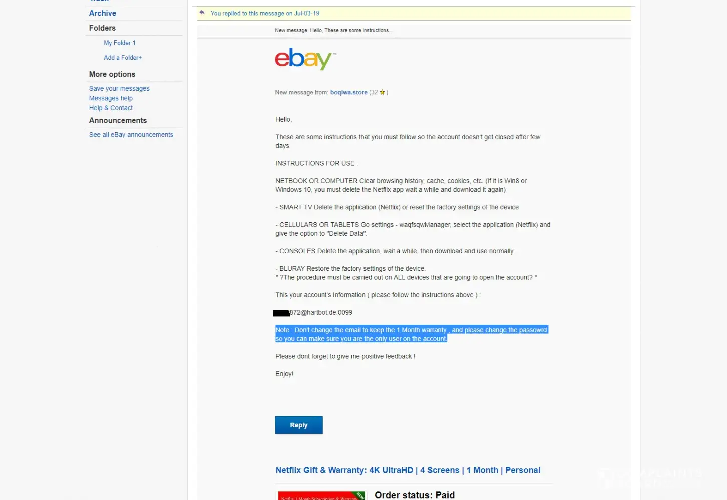 On this person's ebay store(boqlwa.store), he is selling these digital items: netflix accounts and the listing is called " Netflix Gift & Warranty: 4K UltraHD | 4 Screens | 1 Month | Personal " for $5 each.When I purchased from this seller, he sent me an ebay message with the "netflix account details" and notes that the "warranty will be voided if the e-mail is changed" This listing is a SCAM, Buyers like me that bought this has no power over the netflix account.The seller can change the login and password at anytime and say the buyer has changed the accounts details leaving the buyer with nothing.After I tested the netflix account credentials, I messaged him saying that the accounts details he sent me does not work and I provided a screenshot to him that the account doesn't even exist.He messaged me back saying "we both know that you changed the e-mail to the account." That doesn't even matter for the buyer because the seller can always change back the account details no matter what by doing a hard reset calling netflix company on the phone.On one of the his/her's other listings that sells netflix accounts it says 17 has sold in 1 hour, I JUST HATE TO SEE HIM/HER GETTING AWAY WITH THIS, THIS IS WRONG AND HAS TO BE STOPPED.HE'S MAKING A TON OF MONEY BY DOING THIS SCAM ON EBAY.Once the buyers give a positive feedback on ebay, there's no turning back, cannot edit the positive feedback. After the buyer puts a positive feedback, the seller can change the netflix account details and give the account details to the next victim so the victim can give a positive feedback saying it works, it's a scam cycle.This ebay seller has to be stopped, this is criminal. Even though it's only $5 each buy but it adds up very quickly, like seriously 17 sold in 1 hour and this seller is getting away with it. People is not reporting it because it's only $5 and left a positive feedback already so it's too late. Not me, I am the only buyer that left the seller a negative review.Below is the seller's ebay store. I know there are other netflix account listings out there but this is the seller I purchased from. STRAIGHT UP SCAM. He requested a partial refund of $1.99 but why am I giving him an extra $3 when I get nothing? He risked $5 for his first negative feedback.