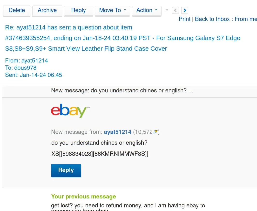 I have purchased many items from E-bay without difficulty from a seller or E-bay and I am pleased with the quality of service I have received in the past. I hope that you can resolve this issue so that I can comfortable continue to be an E-bay customer. Thank you in advance for your time and anticipated cooperation in this matter.