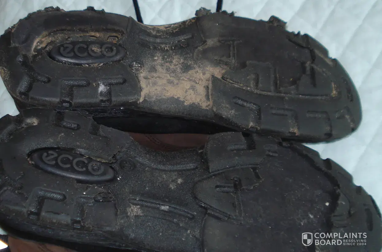 I bought a pair of Ecco boots and after wearing them only a few times the soles completely disintegrated. I thought there must be a fault so sent an e mail with supporting photos to the manufacturer, but having read of so many people having a similar experience and being ignored by Ecco I am no longer expecting a reply. Perhaps all those of us who have had problems with Ecco should contact the trade standards authority. These are certainly not cheap boots and shoes. I have had far better wear from much cheaper boots from Cotton Traders and Millets. As you can see by the photos, although the soles have had it the uppers are in little used condition.