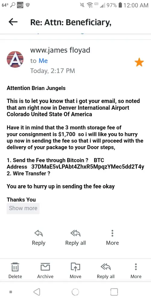 I got a text message of the same deal his name James Floyd number is [protected] he want me to pay him bitcoins. Then he will give me tracking number here's the picture of the package and my name is Brian Jungels number [protected] and you can text me and let me know
