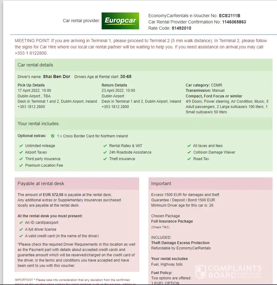 Rented a car with insurance from EconomyCarRentals in Dublin airport on April. I damaged the car which the policy covers, and the company refuses to pay me back the cost of repairs (€1,403.59) under the excuse of not receiving an email from the rental company for 2 whole months and counting (if they really wanted the information, a simple phone call will sort everything immediately). Looking into hiring a lawyer. Be careful when dealing with this company.