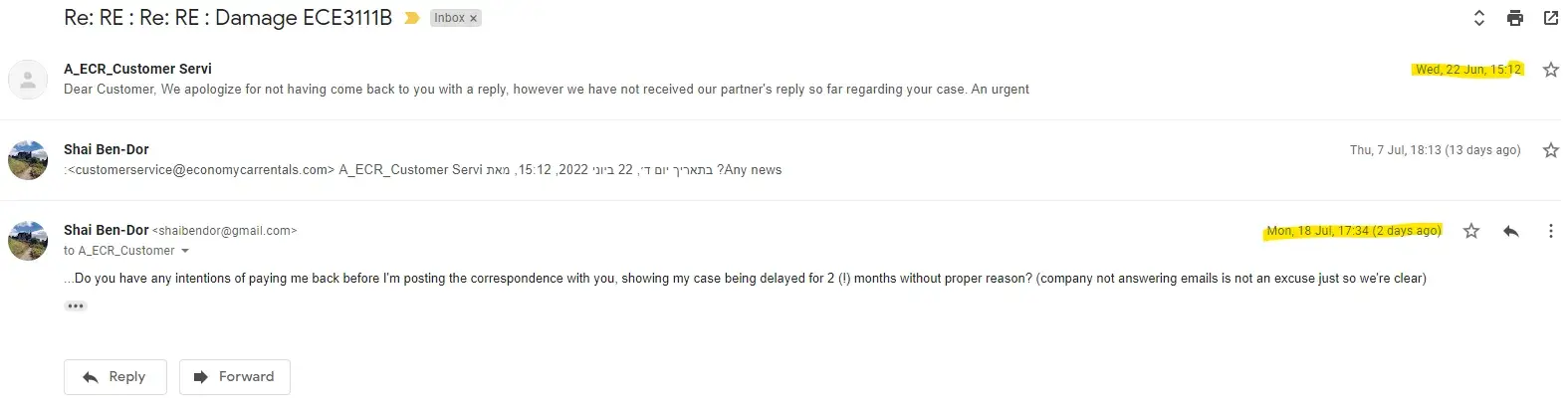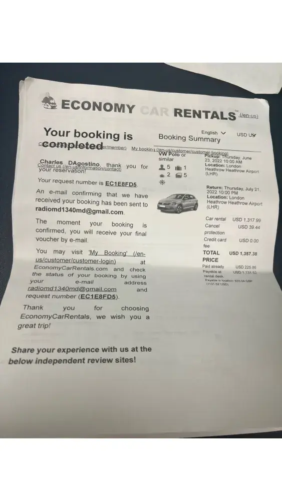 I rented a car through EconomyCarRentals and purchased their reimbursement insurance, trusting that I would be covered in case of an accident. Unfortunately, their insurance is completely misleading and unreliable. I was rear-ended by another driver and had to pay the repair costs upfront. I followed all instructions—submitting documents, photos, and...