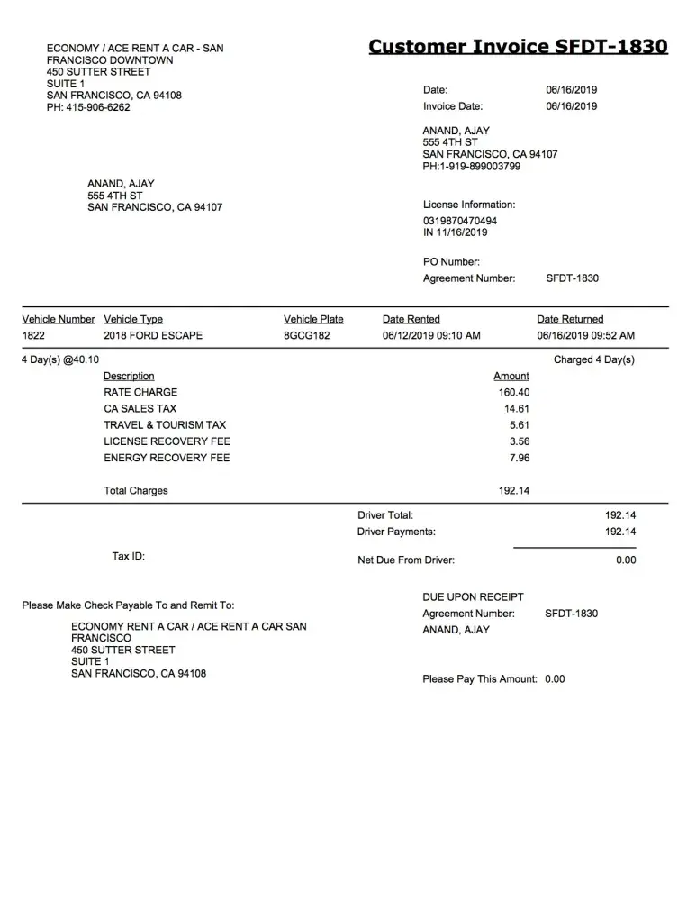 We hired a car from 12th to 16th June from San Francisco vide invoice no. SFDT-1830.