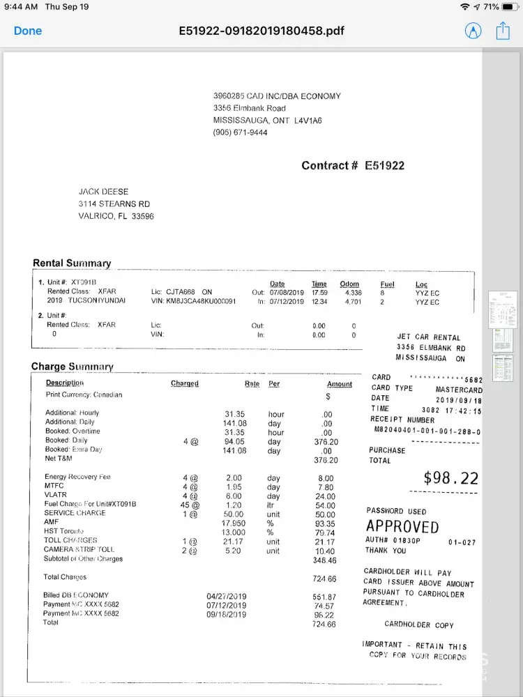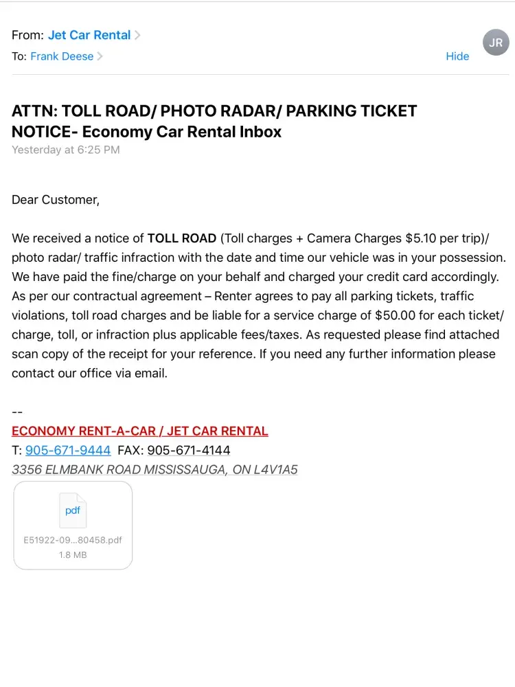 Between 7/8/19 and 7/12/19, over two months ago, we rented a 2019 Tucson from the (Economy) Jet Car Rental. Yesterday, I received an email with attached, additional toll charges and fees totaling $98.22 (Canadian). $50.00 of the charges is for a "service charge", the remainder is apparently for tolls. Although there may have been tolls that I missed, at this point I do not recall them. Likely they were on a toll road without toll booths in which to pay. Since most people renting cars from this particular location are likely going to Niagara Falls like we did, I suppose this is a daily issue that should be anticipated by Economy. To charge someone $50 two months after renting a car as a "service charge" is likely an often repeated scam. Especially, when the charges should have been anticipated by Economy. We are retired and frequently travel and have rented cars in many locations but haven't seen an operation like we observed at the Jet Car Rental. When we arrived we waited our turn and observed different customers arguing with the staff. Later, when we returned the car, still other customers were arguing with staff. I don't know what the disagreements were about but thought the occurrences were oddly frequent. I have attached a copy of the email and break down of charges they sent me. The accompanying email explains the $50 service charge. Please also note the many other toll charges for many other license plates. I suppose they all also had to pay the $50 "service charge". Please investigate this and let me know what action your company will be taking. I would also appreciate the charges being reversed and credited to my credit card. I have attached the information they sent me and await your prompt response. My email address is [protected]@msn.com.