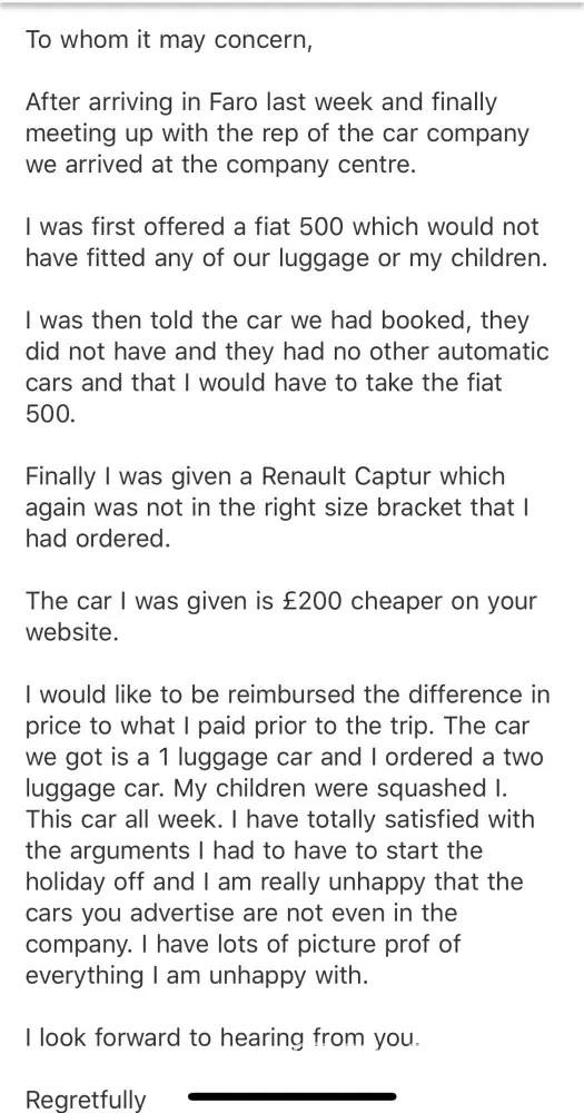 I hired a car in August through you while being on holiday in Portugal. The car I received was smaller than the vehicle I paid for and at no time was offered a discount. I want this investigated immediately and have many pictures showing the car I was offered and the car I was given. I have sent numerous emails to you and have only had apologies that it is taking so long. This isn't good enough. I have attached the documents showing the above with no response.