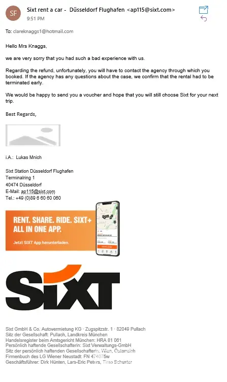 I have had a problem with the car (flat tyre) where i needed roadside assist (there was no spare tyre in the car!)- I tried calling for over 3 hours and nobody answered and when they did I got disconnected, I am a female alone in Germany and do not speak the language so the situation was dangerous and unacceptable service. I managed to get help to move the car to a safe space from a stranger until the next morning. I tried to call sixt again the next morning, i was on hold for over one hour, and got disconnected, i tried again and after 45 minutes on hold they sent a tow company to pick up the car. They took me to repair garage, when we arrived the garage knew nothing about the car or why it was there, despite the tow company leaving me. I was again left there alone with no information the garage kindly called Sixt who said they were going to call me and send a new car, this did not happen. I waited for over 2 hours at the garage and tried to call and they did not answer, i had to take a taxi to my air bnb. I called Sixt for a replacement car and was again on hold- when i finally spoke with somebody she could not help and “created a ticket†nobody called me that day and have still not returned my call.