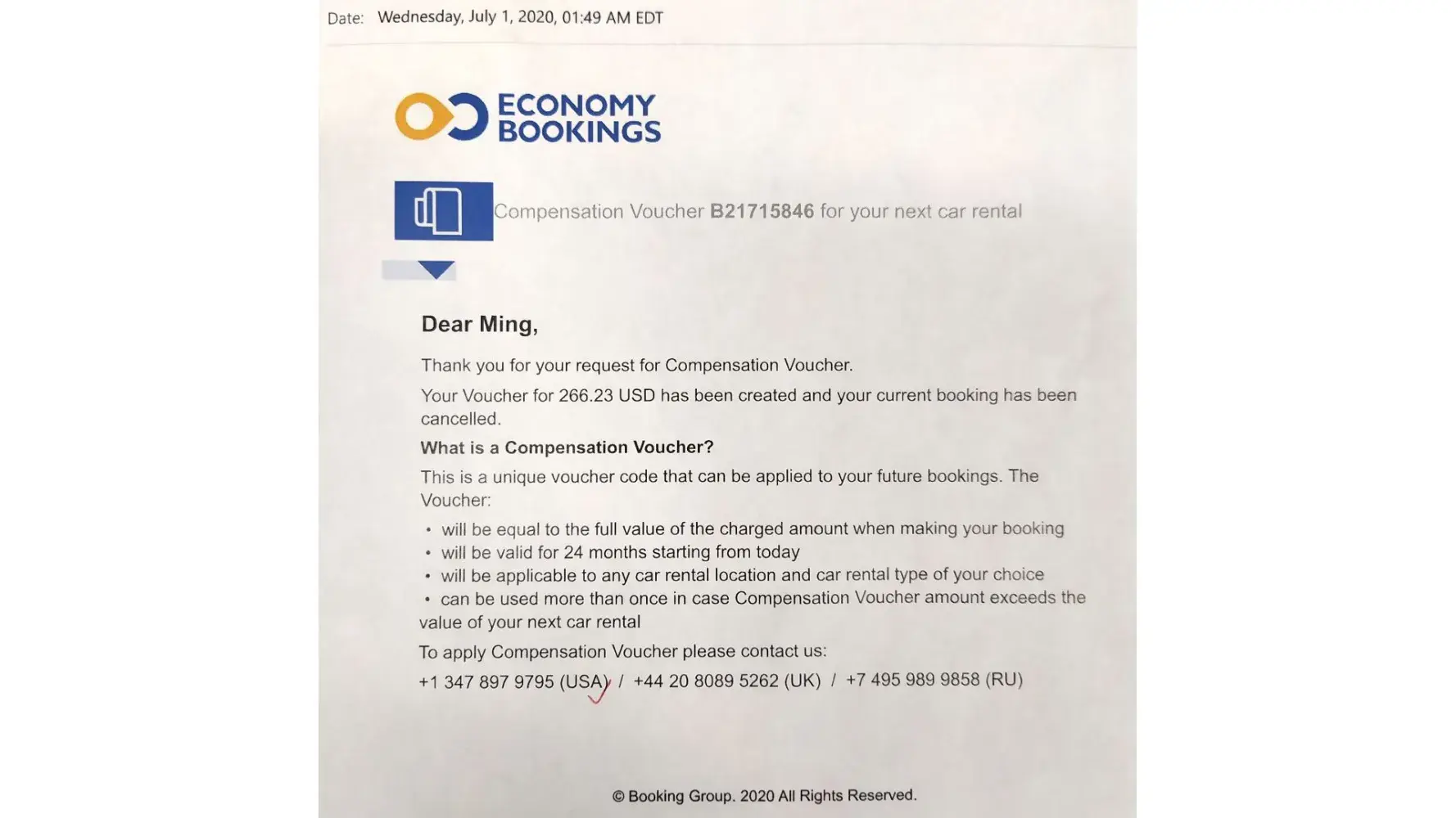 My name is Ming Xia. I had a booking in Boston airport in April 2019, but it was cancelled because of COV-19. Every beginning, I was told the refund would be issued within 60 days. Then the refund was postponed to 90 days later. Finally I was told I could only get voucher (B21715846, $266.33) instead of promised refund. The expiration date would be July 1, 2022. When I tried to search car rental in my nearby area, I was always told there were not car available in this area. That means I can not use it. I was trying to reaching economy bookings by calling [protected]. But I was told I have to contact customer support by email. They do not have a phone number. So I am stuck now.