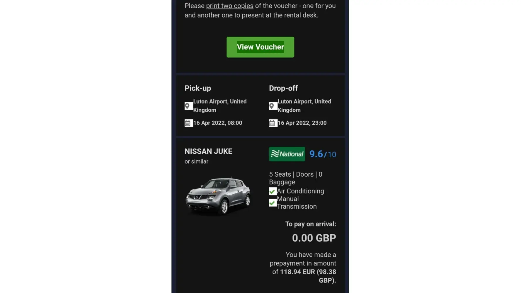 On Voucher it is clearly written their office works till 22.30 but they still refused to give me the car- despite my reservation and payment was valid for the whole day.I attach their confirmation I didnt get the car for which I made reservation via your platform Economybooking.