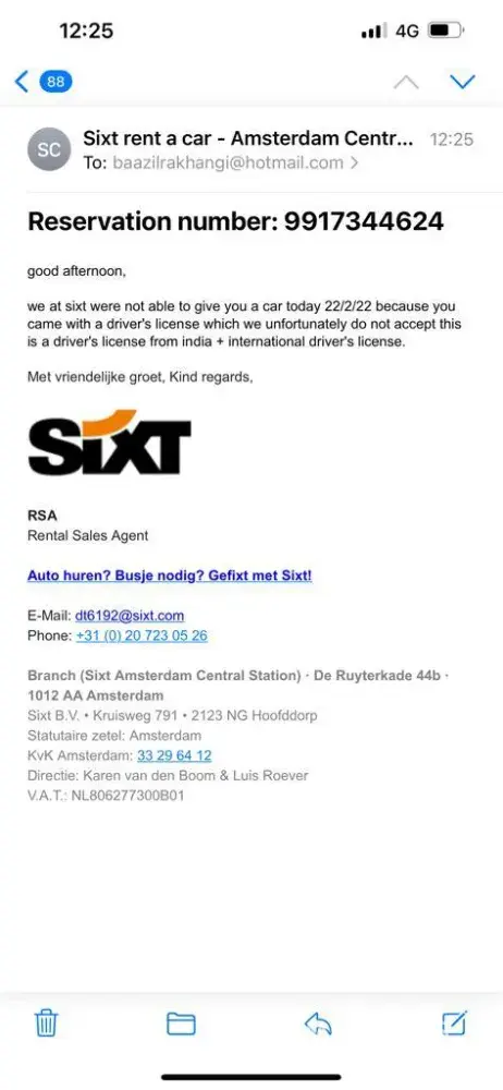 Booked car from Economybookings with booking number B22075754. Booking was for Sixt Car at Amsterdam. The shop manager denied giving the car despite showing him international driving permit and driving license. He clearly stated we cannot give you car because of 2 things:
