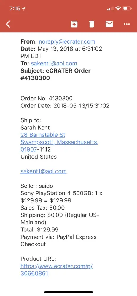 I bought a ps4 from "Watkins" around the beginning of September and it's about to be October and I haven't received anything in the mail yet. I tried contacting "Watkins" through email but this person never responded back. I currently have no other possible way of getting this situated so to file a complaint is the final resort.
