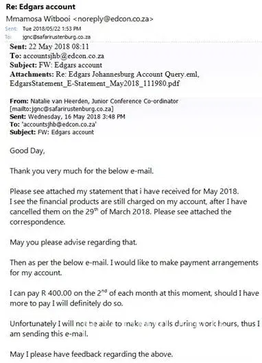 My Edgars account has been handed to attorneys, i contacted the attorneys to make payment arrangements, debit orders has been going off since April. I have requested statements since April but too no avail. Last week 1st August i contacted Edcon to either issue me with statements and a payment arrangement letter.