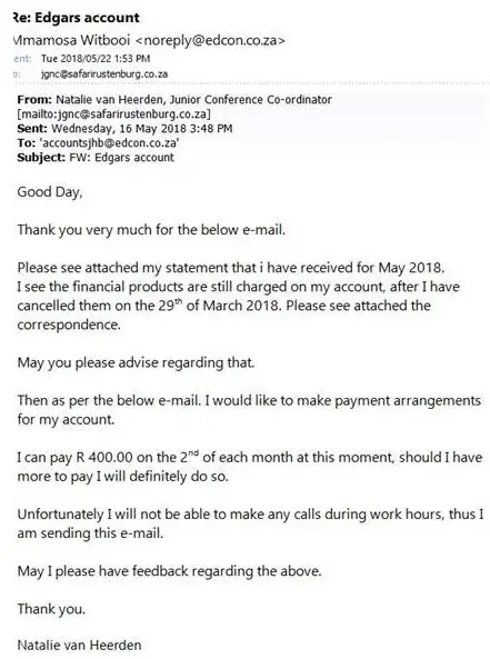 I have made arrangements regarding my account at Edgars, as my son was very sick for the past two months. I have e-mails confirming on a specific amount that Edgars agreed on, that I can pay until my account is paid up. I am aware of extra charges the will be, as I am behind on my account. After a few e-mails that was sent, with no reply, I eventually got a reply yesterday. After I have cancelled all my policies on the 29th of March 2018 on my account, it was still charged on my account when my statement was sent to me this month. And then this morning again, a very arrogant lady by the name of Sillo (011 491 1210 - 07:34 am - 23/05/2018) calls advising that I should pay my account and I said that I have made arrangements and I will do it accordingly. Then she advises that the amount of R 400.00 cannot be an arrangement, as that is too little I have to pay more. So I said I cannot at the moment, that is why I have made arrangements. She has a huge attitude problem, and does not give a person time to speak! I am not happy with the service at all! Why did I make arrangements with Edgars, if she is going to tell me well I should pay more? And threatening me with lawyers..if so, please go ahead then! Edgars can be sure that I will close my account once it is paid up. Please go and listen to the recording, as she said the conversation will be recorded.