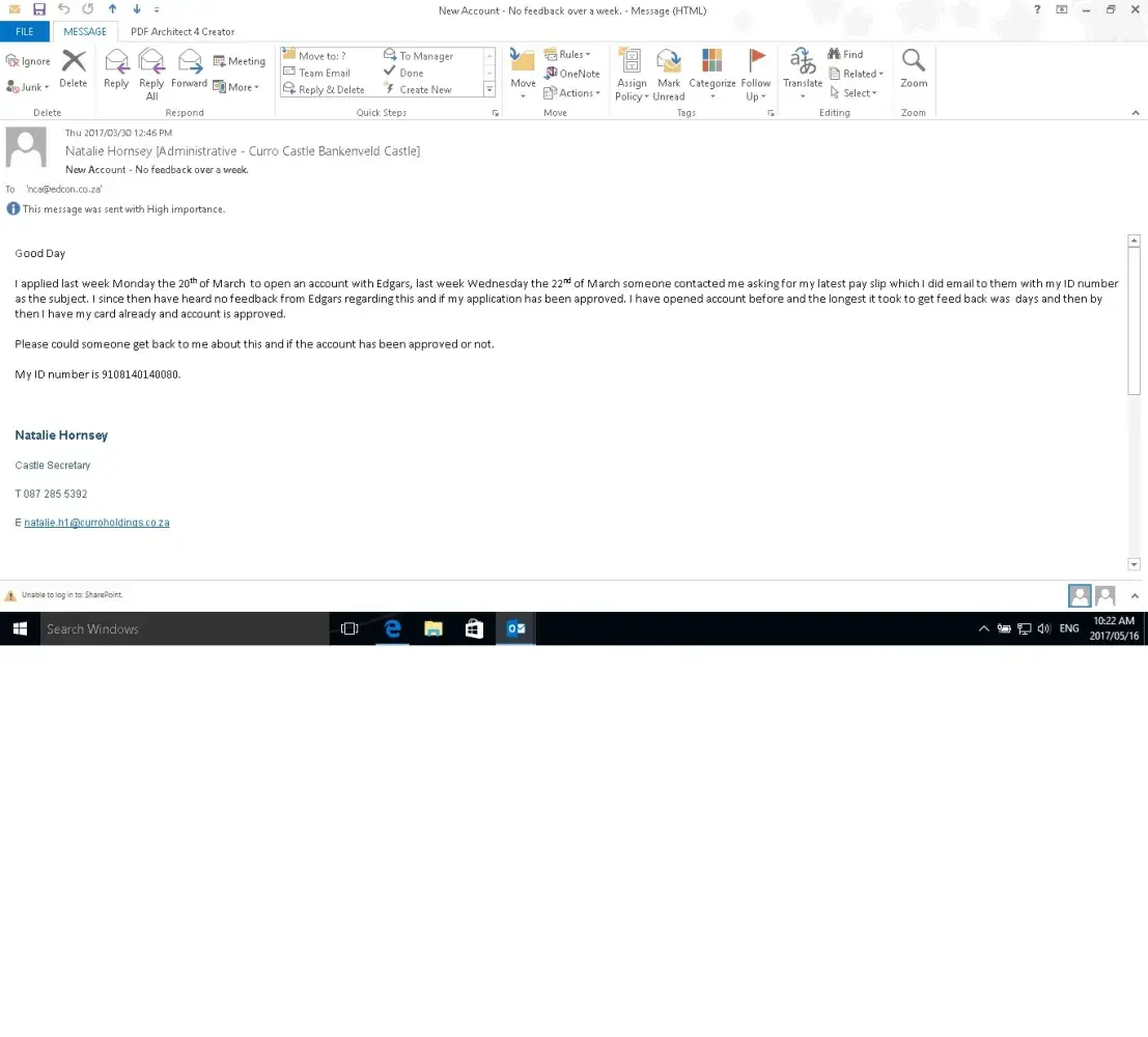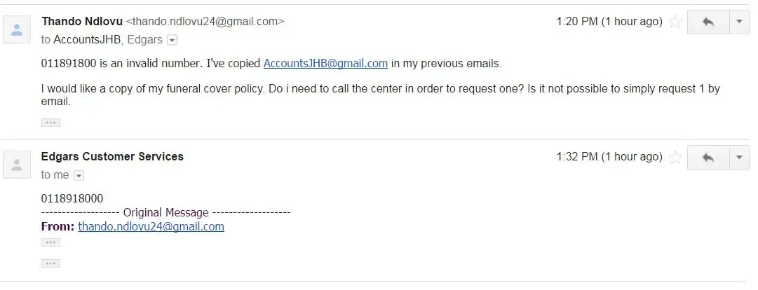 I applied in March to open an account with Edgars. I applied online and completed everything. I submitted all the docs even when I received emails asking for the supporting docs. I would call the customer service centre to try and get feedback back on my account process and if I have been approved or not and every time I called no one could seem to help me and would tell me someone would get back to me. I have attached a photo of the last email that I sent to the edcon group asking for feedback and since that email has been sent I haven't heard a thing back from edcon group.