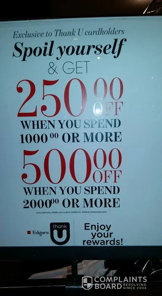 Beware of this bogus sign. After buying for over R3000, I was told I'm not eligible for this discount as I should have received a sms with a voucher number to get the discount. This sign clearly say "exlusive to thank u card holders" and not random card holders or card holders which received a sms. Is this the type of service which we should expect from you. Maybe change the card name to thuck you.