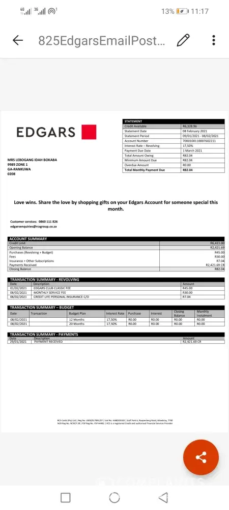 Last month, I paid my Edgars account upfront, and requested for it to be closed. Let me add some background - previously I went to Edgars in St Georges Mall before they closed down and asked them to remove all extra payments on my account as I was unsure of where my money was going and all the extras listed. This date I do not have as I was unaware that this wasn't updated