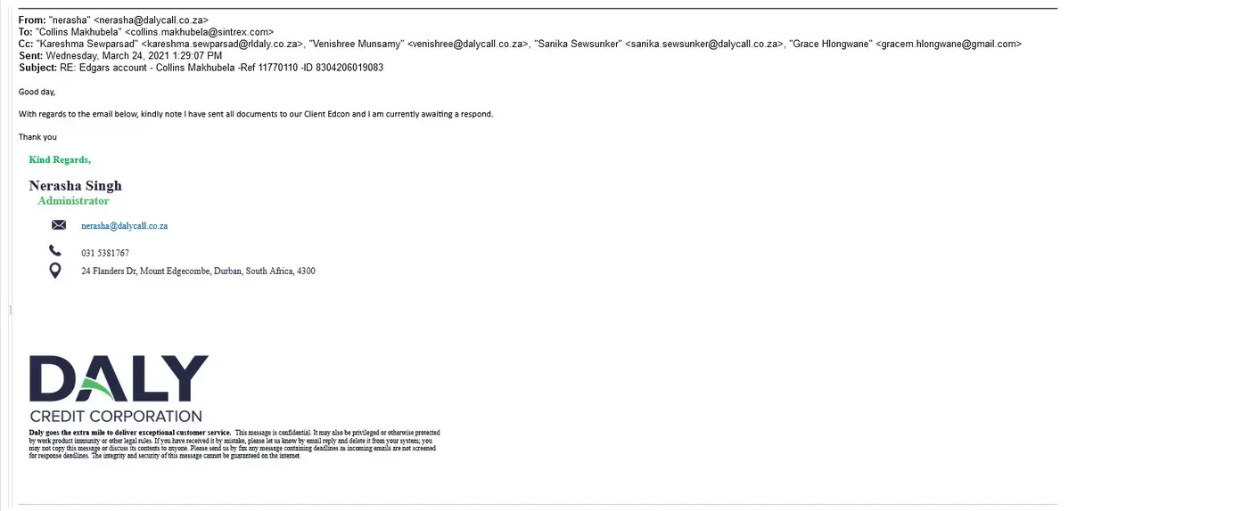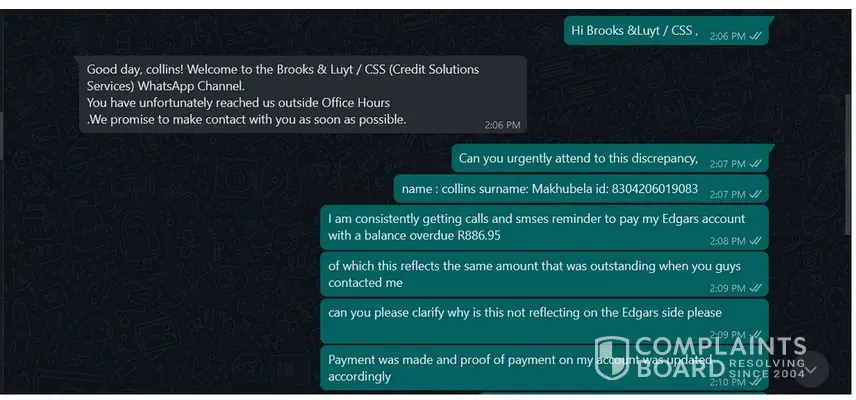 Good day all, I have a huge issue with the Edcon/Edgars/RCS group that I need to address, and hope others will follow suit because it appears that Edgars is now in the business of scamming people, my account fell in arrears sometime in 2020 during the covid19 lockdown period, I received calls from debt collectors ( Brooks & lyt / CSS solution ) on behalf of Edgars and made an arrangement for an amount to R400 from the R886.95 outstanding balance that was outstanding, therefore a day later I proceeded as advised and a minimum of amount R400 was paid on the 14 Jan 2021 and proof of payment was submitted to the debt collector via email & WhatsApp of which the receipt acknowledged, now after I visited the store : Southgate branch to try to pay the remainder balance expected being the difference from the R400 that was paid and to learn that the overdue balance was still reflecting the same R886.95 and I was advised to wait for at least 7 working days to see if the account will be updated once the money was cleared into the Edgars account up until date my account still reflects with the same balance and nobody can account the payment that was made to the debt collectors on behalf of Edgars, I went to the store and I was advised to contact all the parties involved vvm, rcs group, brooks & lyt/css solutions including edcon but I am currently caught in-between turmoil with nobody taking into account of the payment that was made even after Brooks & lyt acknowledged the payment on behalf Edgars has left me to play detective in tracking the payment although there's concrete proof from my bank on where the money was paid to reflecting the full details of the payment to and from including the amount paid but to date I am being sent from pillar to post, it appears that the money has vanished into thin air, I have tried several channels to communicate with the relevant parties to assist in this matter but as usual i receive no feedback nor response on this matter, I am really tired and irate on this matter and all I need is a way forward so that I can pay the remainder balance and close the account, I can be contacted on [protected]