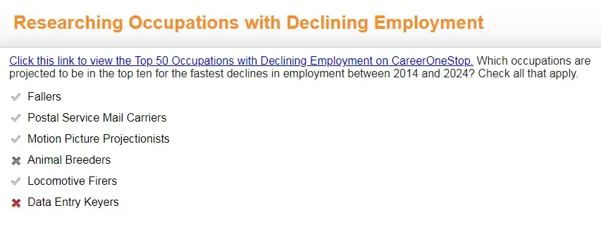 This is upsetting considering the fact that I need to be able to pass this class on order to get credit and graduate but these outdated answers are making it harder. The class asked for data from 2014-2024 and on the website it only had information on data from 2016-2026 or other years. This is also sometimes occurring on the o*net website.
