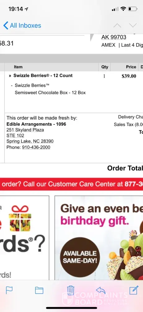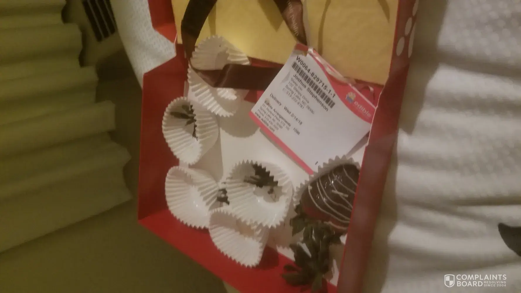 My wife sent a dozen strawberries from the Spring Lake, SC location to my hotel. I picked them up and they were delivered on time, but only half of them in a box only large enough to fit half of them. Not happy at all, and it'd be really nice if my wife could get a refund for the whole ordeal. She even tipped extra to make sure it'd get delivered directly to my room, but they even messed that up. I had to go down to the desk and request it and by that time she told me what she was getting me so I could ask them, and the whole surprise was ruined. Severely taken aback that a company with such great reviews could do this to us. I've eaten 5 of six now because strawberries are perishable, but one is frozen because the hotel put it in a refrigerator.