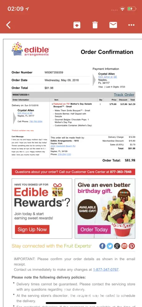 You will see my receipt that will give you all the information that you will need. I order this arrangement for my elderly Parents. The melon was so hard they couldn't eat it, the cantaloupe like carrots it was so hard. The strawberries were pretty but so sour you couldn't even eat the chocolate covered ones without puckering up. I was very disappointed all I ever heard was you had the best fruit. This is the first time I order from your company. I could of gone to Aldi's and got better.