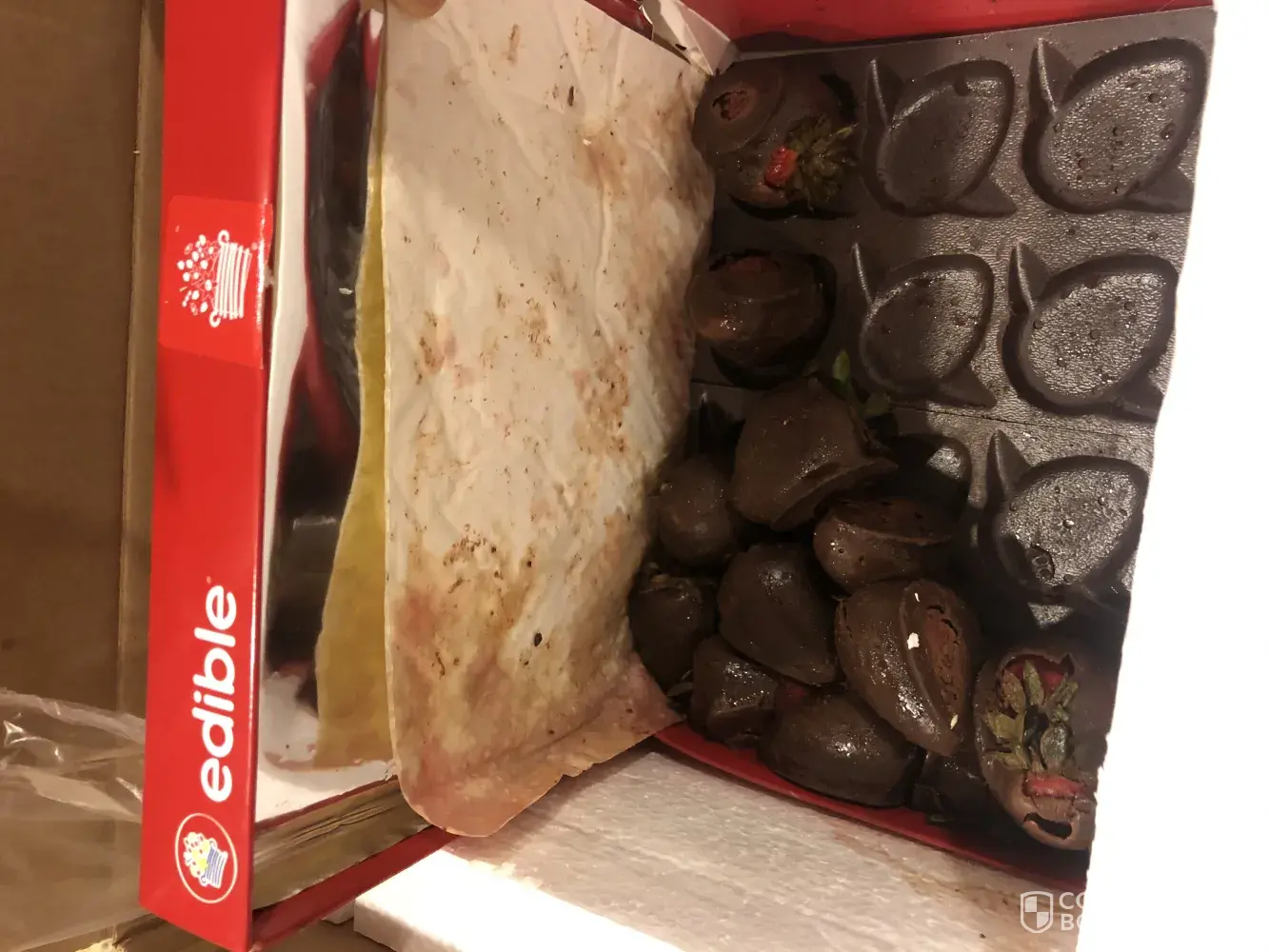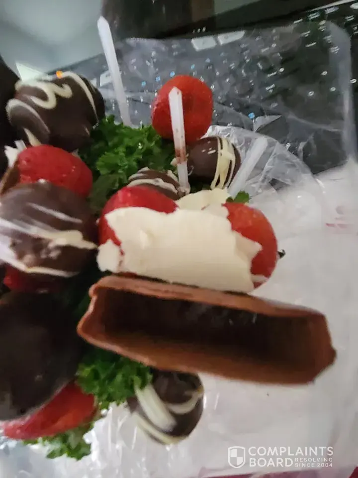 Item was ordered online, never delivered on date I paid for, had to go to the shop to get arrangements and when picked up Pineapple was bad and old, the chocolate on them was falling off and not edible. store never answered the phone calls, then after I picked up the arrangements i get an email saying that the arrangement was successfully delivered. The chocolate covered strawberries were supposed to have pink swirls I paid an additional 5.00 for. but this one had white swirls which is free. I am totally never using edible arrangements again if this is not rectified. 93.00 for an arrangement that half of it was inedible.